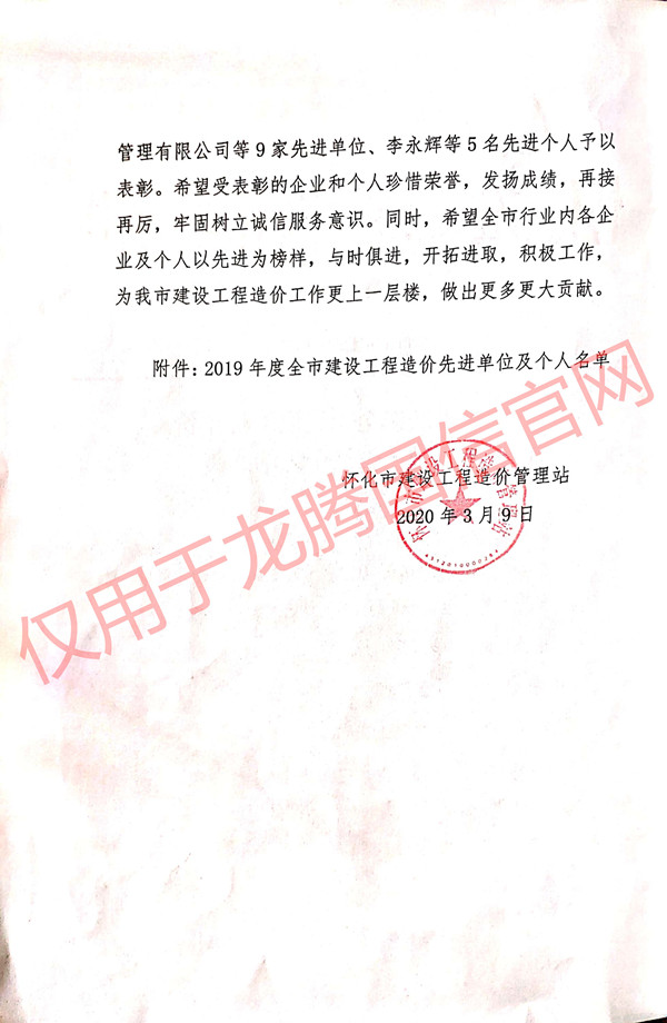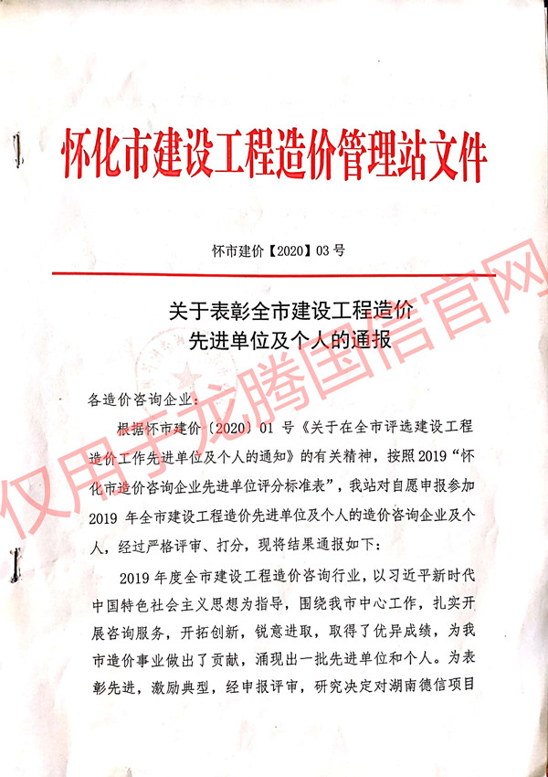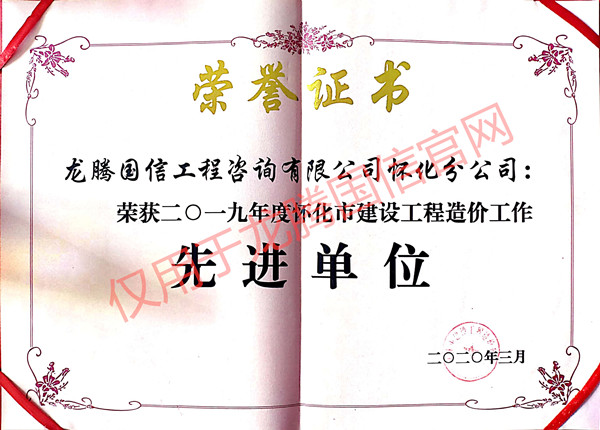 根據(jù)‘懷市建價【2020】03號’文件,恭賀本公司榮獲‘2019年度懷化市建設(shè)工程造價工作先進(jìn)單位’。