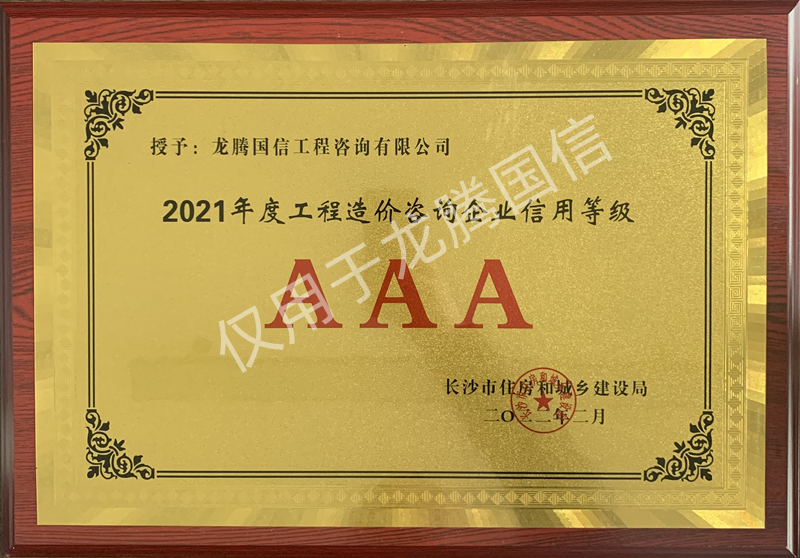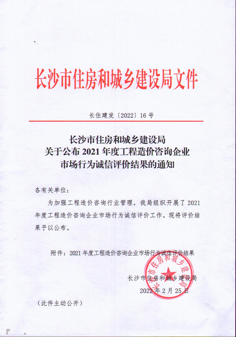 長(zhǎng)沙市住房和城鄉(xiāng)建設(shè)局為加強(qiáng)工程造價(jià)咨詢行業(yè)管理,組織開展了2021年度工程造價(jià)咨詢企業(yè)市場(chǎng)行為誠(chéng)信評(píng)價(jià)工作,我單位獲評(píng)“2021年度工程造價(jià)咨詢企業(yè)信用等級(jí)AAA”。