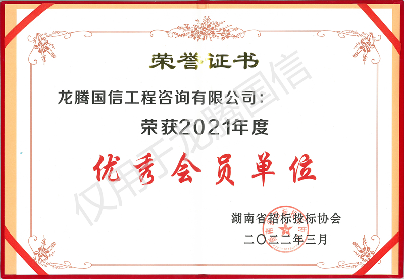 經(jīng)評(píng)審小組評(píng)審,龍騰國信工程咨詢有限公司榮獲湖南省招標(biāo)投標(biāo)協(xié)會(huì)2021年度“優(yōu)秀會(huì)員單位”榮譽(yù)稱號(hào)。