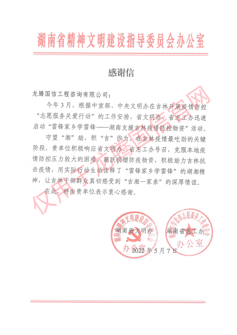 來自湖南省文明辦、志工辦的感謝信