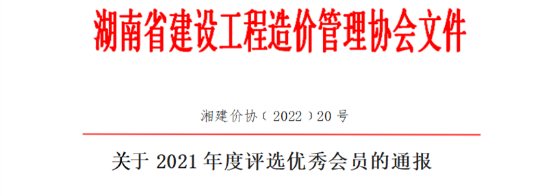 近日,為促進省內(nèi)工程造價咨詢行業(yè)高質(zhì)量發(fā)展,樹立先進典型,調(diào)動會員的積極性和創(chuàng)造性,根據(jù)《湖南省建設工程造價管理協(xié)會關于開展2021年度評選優(yōu)秀會員活動的通知》,經(jīng)會員申報、評審小組評審、集體研究、結(jié)果公示等環(huán)節(jié),我單位榮獲“2021年度優(yōu)秀單位”、注冊造價工程師陳建榮(黨員)榮獲“優(yōu)秀個人”。
