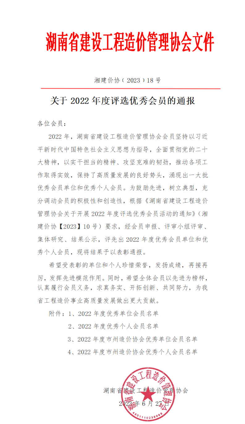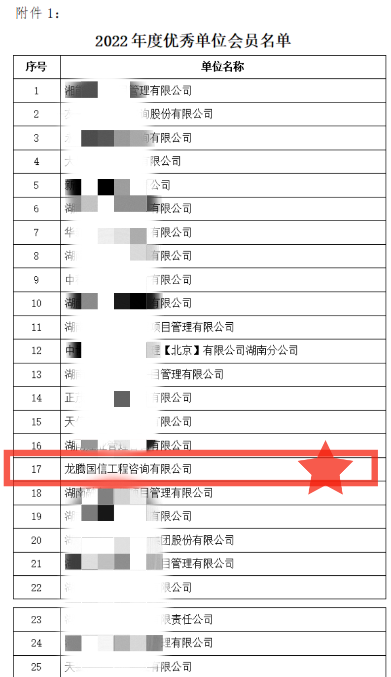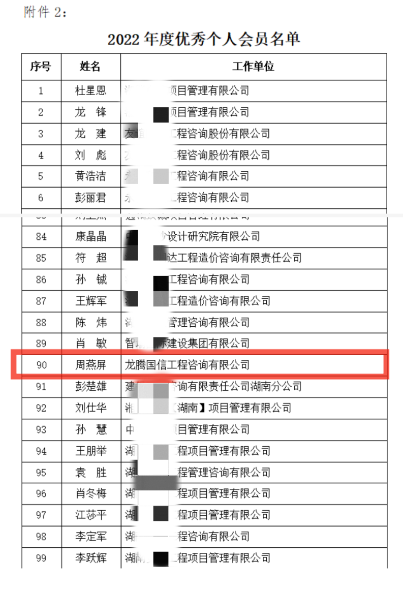 2022年,湖南省建設工程造價管理協(xié)會會員堅持以習近平新時代中國特色社會主義思想為指導,全面貫徹黨的二十大精神,以實干擔當?shù)木瘛⒐钥穗y的韌勁,推動各項工作取得實效,保持了高質(zhì)量發(fā)展的良好勢頭,涌現(xiàn)出一大批優(yōu)秀會員單位和優(yōu)秀個人會員。為鼓勵先進,樹立典型,充分調(diào)動會員的積極性和創(chuàng)造性,根據(jù)《湖南省建設工程造價管理協(xié)會關(guān)于開展2022年度評選優(yōu)秀會員活動的通知》(湘建價協(xié)【2023】10號)要求,經(jīng)會員申報、評審小組評審、集體研究、結(jié)果公示,“龍騰國信工程咨詢有限公司”榮獲湖南省建設工程造價管理協(xié)會2022年度“優(yōu)秀單位”、公司造價工程師周燕屏獲“優(yōu)秀個人”榮譽稱號。
